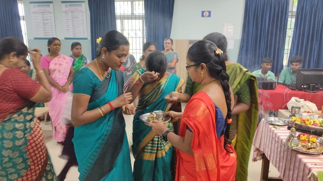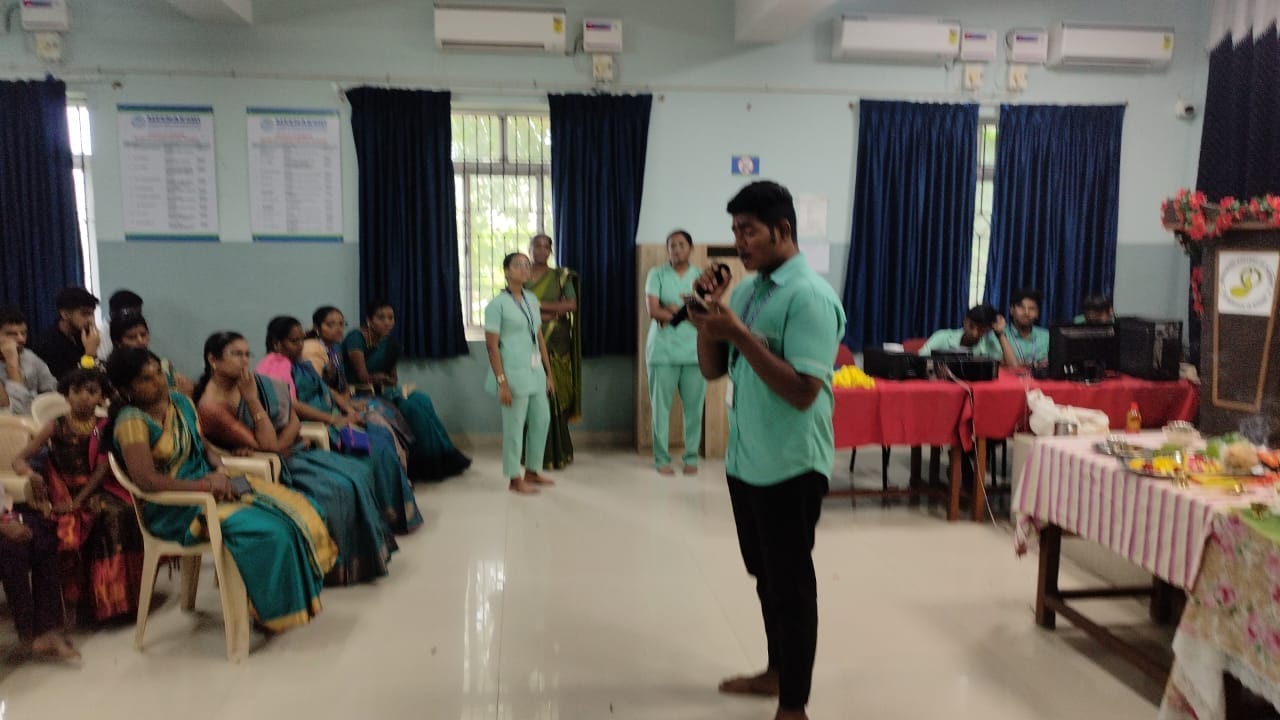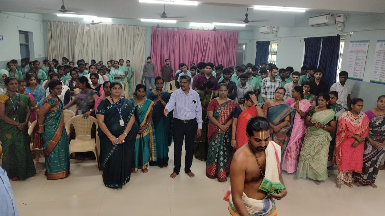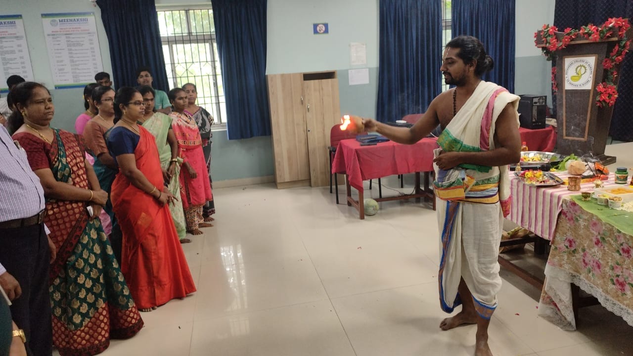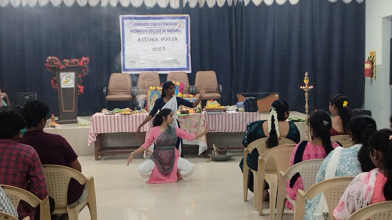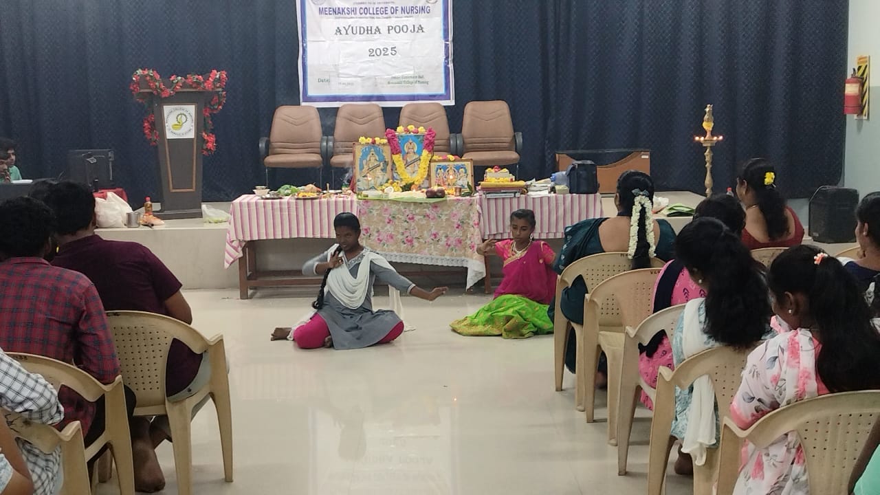 The Student Council – SNA Unit of Meenakshi College of Nursing organized a vibrant Ayudha Pooja celebration on 19th September 2025 at the College Conference Hall from 9:15 a.m. to 10:30 a.m. Ayudha Pooja, a traditional festival expressing gratitude towards books, tools, and vehicles, is an occasion that fosters cultural values and strengthens community spirit within the institution. On this auspicious day, the three principal goddesses—Saraswati (learning), Lakshmi (wealth), and Parvati/Durga (strength)—are invoked, symbolizing reverence for knowledge, prosperity, and strength.