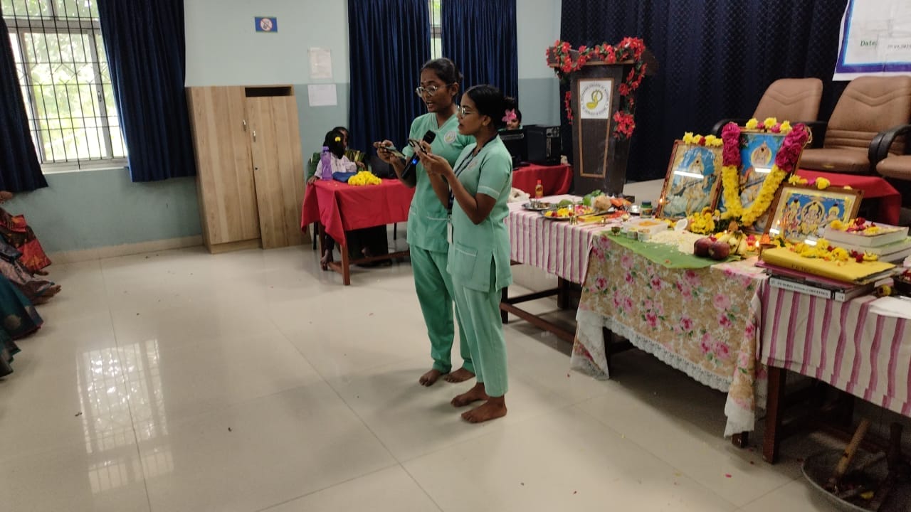 Library books, attendance registers, office files, and laboratory articles were respectfully placed on the puja pedestal and worshipped, highlighting reverence for learning and professional tools. Ms. Sailaja R, B.Sc. (N) II Year, delivered the welcome address, followed by cultural performances by B.Sc. (N) I and IV Year students, which included a classical dance and devotional songs, adding color and vibrancy to the occasion.