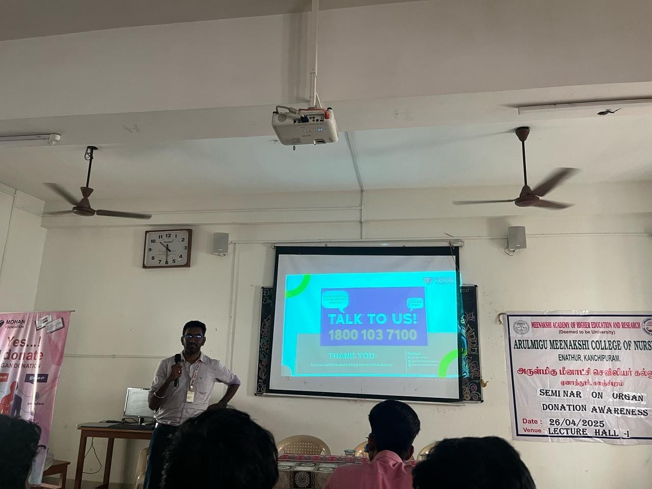 Arulmigu Meenakshi College of Nursing (AMCON), MAHER, in collaboration with MOHAN Foundation, Chennai, organized a Seminar on Organ Donation Awareness for students and faculty members. The program commenced with a formal inauguration and a welcome address by Mr. Gokulakrishnan, IV Year B.Sc (N) student.