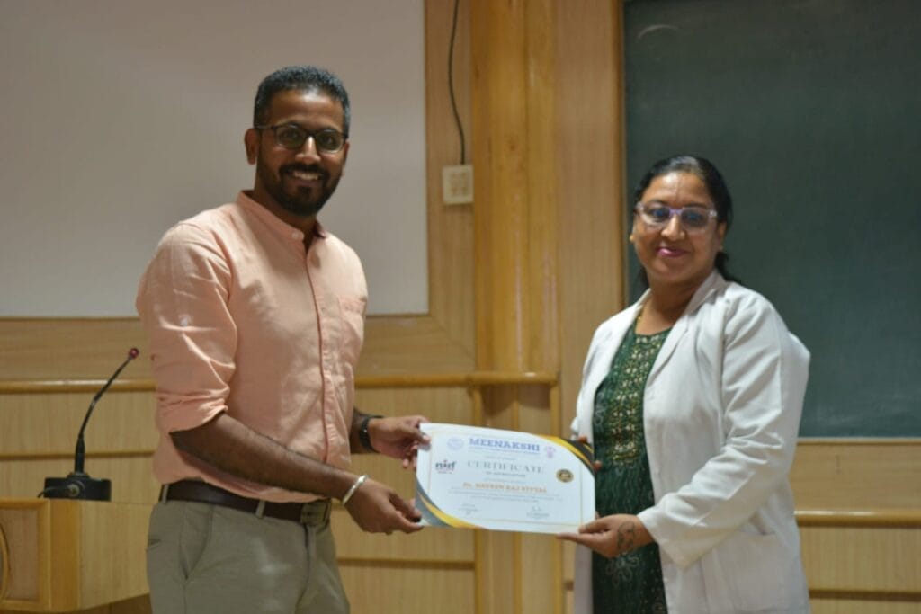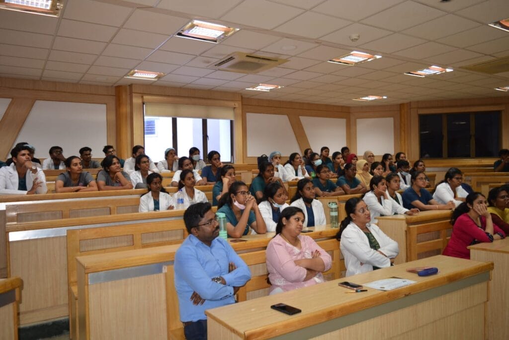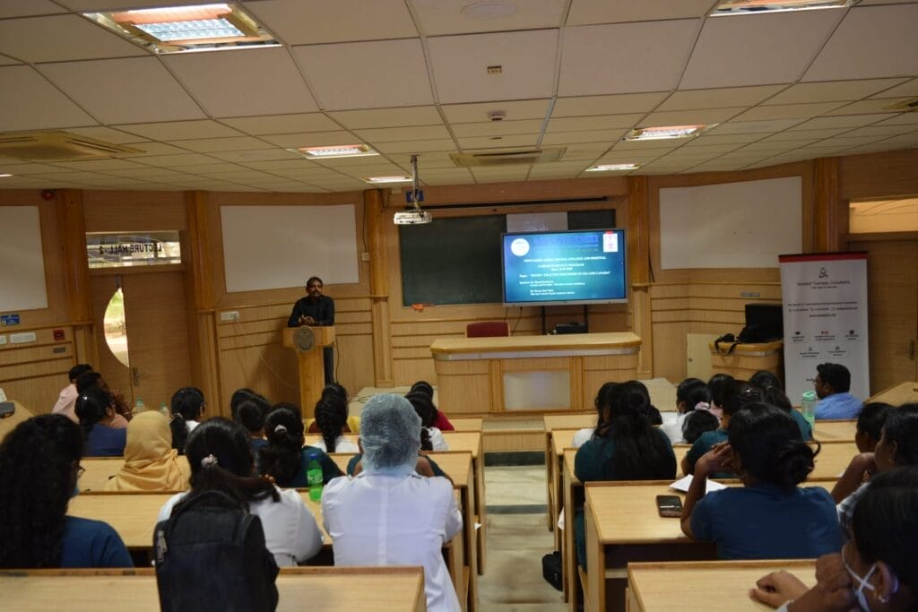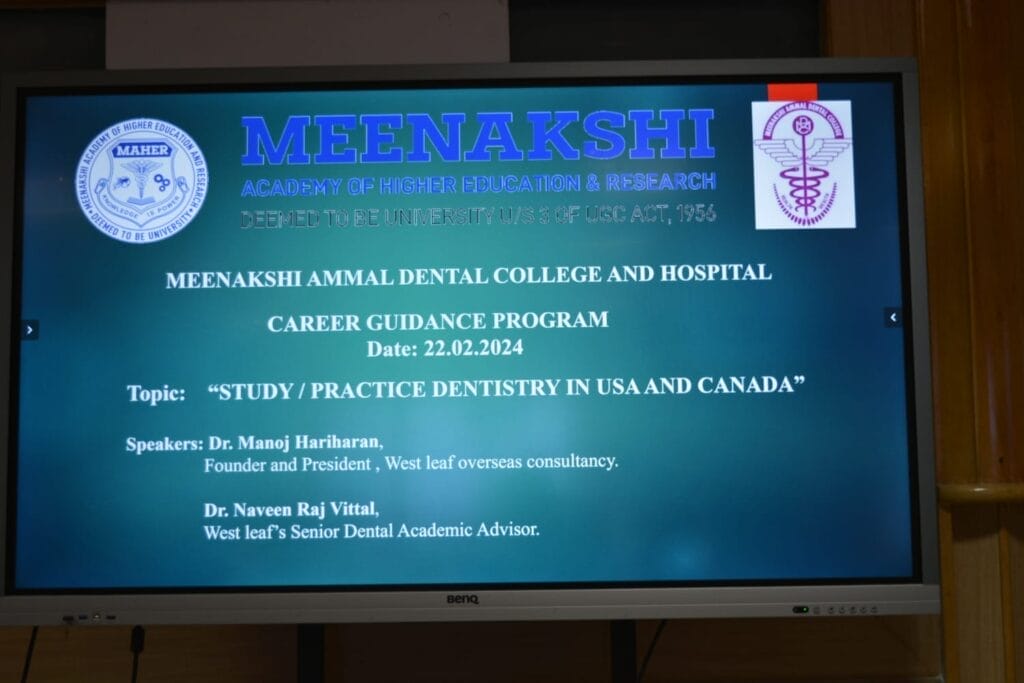 A Career guidance program on the topic ” Study/practice dentistry in USA and Canada” was conducted at Meenakshi Ammal Dental College and Hospital on 22/2/2024. The speakers Dr Manoj Hariharan and Dr Naveen Raj ( alumnus of Meenakshi Ammal Dental College) enlightened the students on the various aspects of higher education, prospectus, and universities offering scholarships in both USA and Canada. They also highlighted the process of gaining a practice license abroad. The program benefited the students immensely.