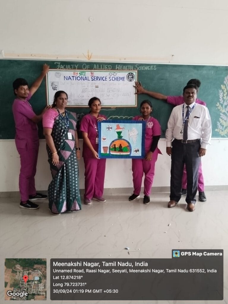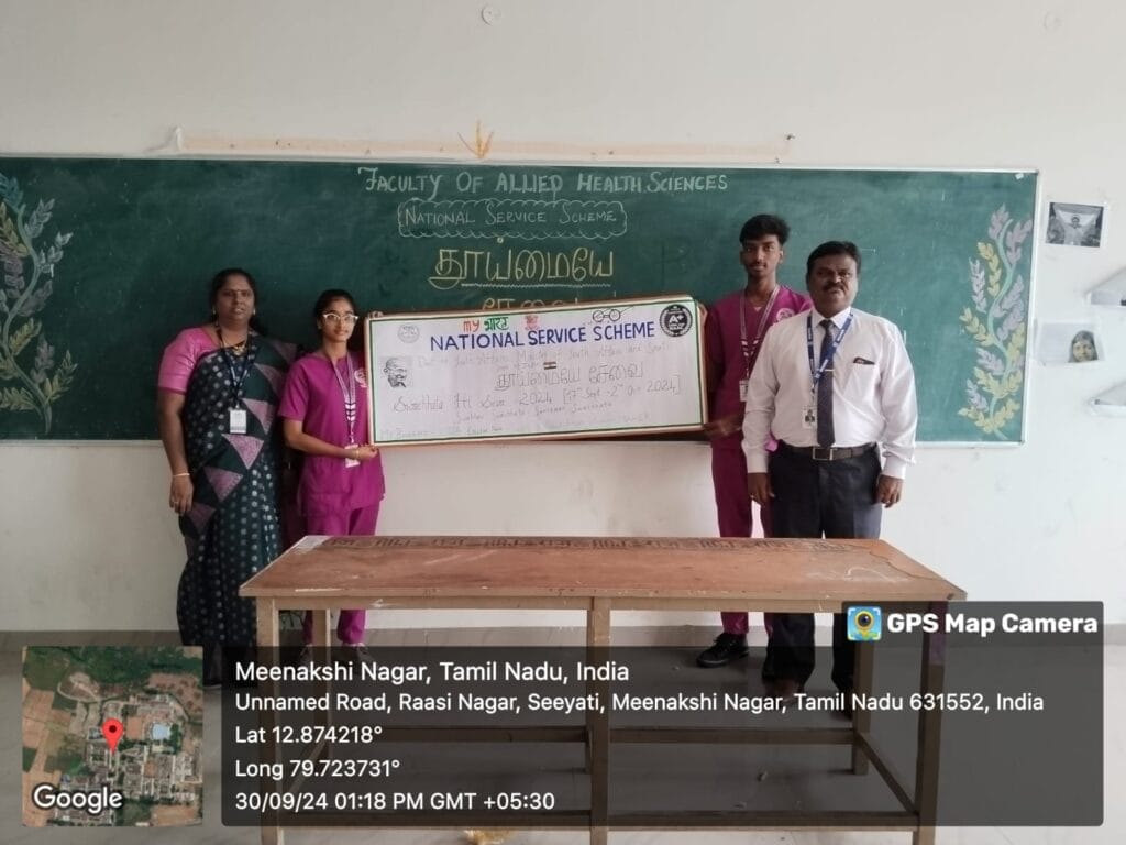 The National Service Scheme (NSS) of the Faculty of Allied Health Sciences, MAHER, organized the Swachhata Hi Seva 2024 campaign from 17th September to 2nd October 2024. Students participated in painting competitions and audio jingles to promote cleanliness and hygiene. Key events included a painting competition on 28th September, student presentations on 30th September, and audio jingles on 1st October. The campaign was supported by Principal Prof. Dr. V. Ramnath, Vice Principal (Academics) Dr. K. S. Sridevi Sangeetha, and Vice Principal (Admin) Dr. B. Durga, promoting a strong commitment to cleanliness and environmental responsibility.