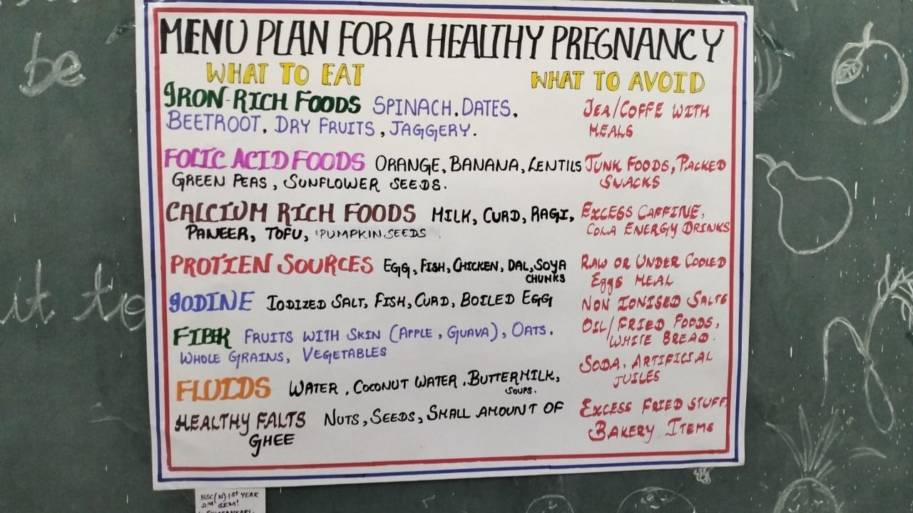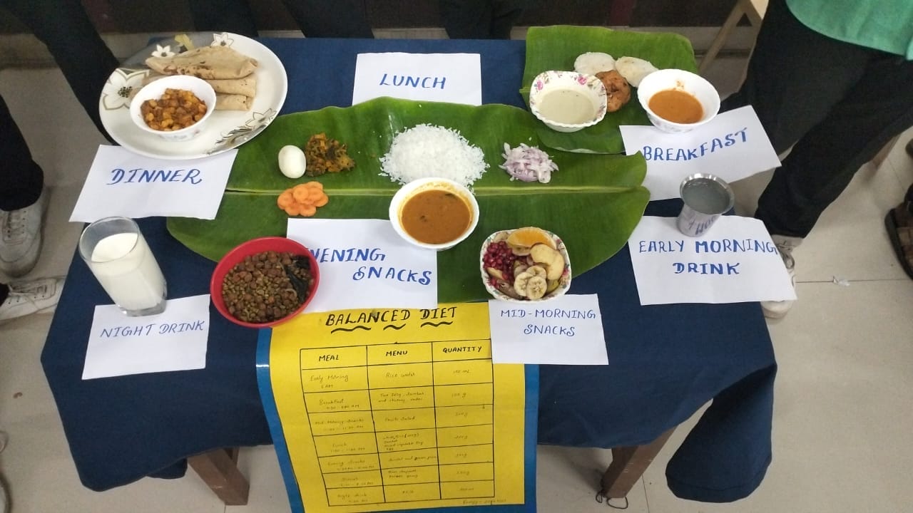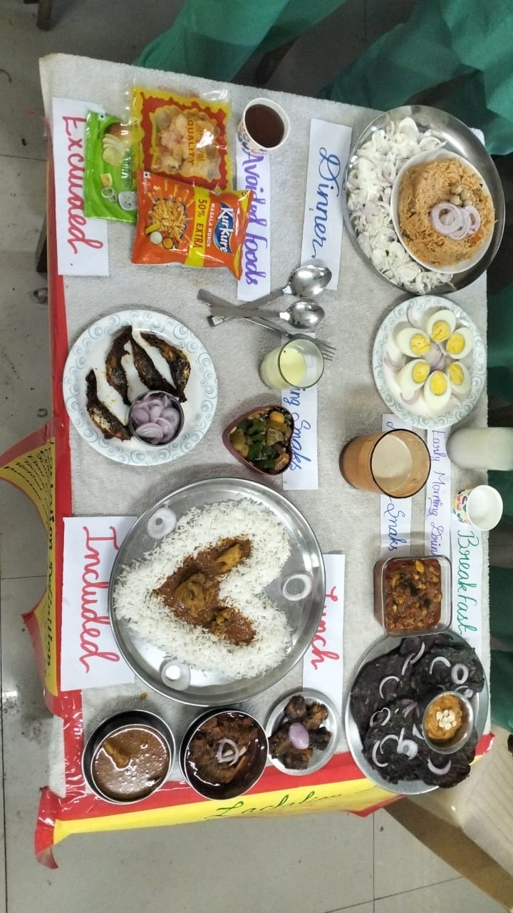 The students were divided into ten groups, each of which presented a model therapeutic diet based on specific health conditions and physiological stages. The categories covered included balanced diet, obesity, diabetes mellitus, cardiovascular disorders, renal disorders, hepatic disorders, pregnancy, lactation, constipation and diarrhea, and nutritional care for pre- and post-operative patients. Each group set up a visual display and explained the significance of dietary management tailored to the specific condition or stage.