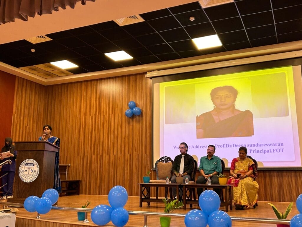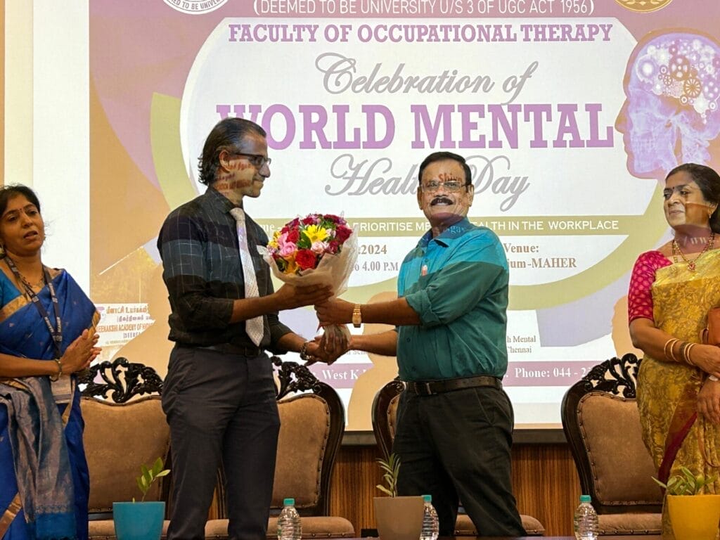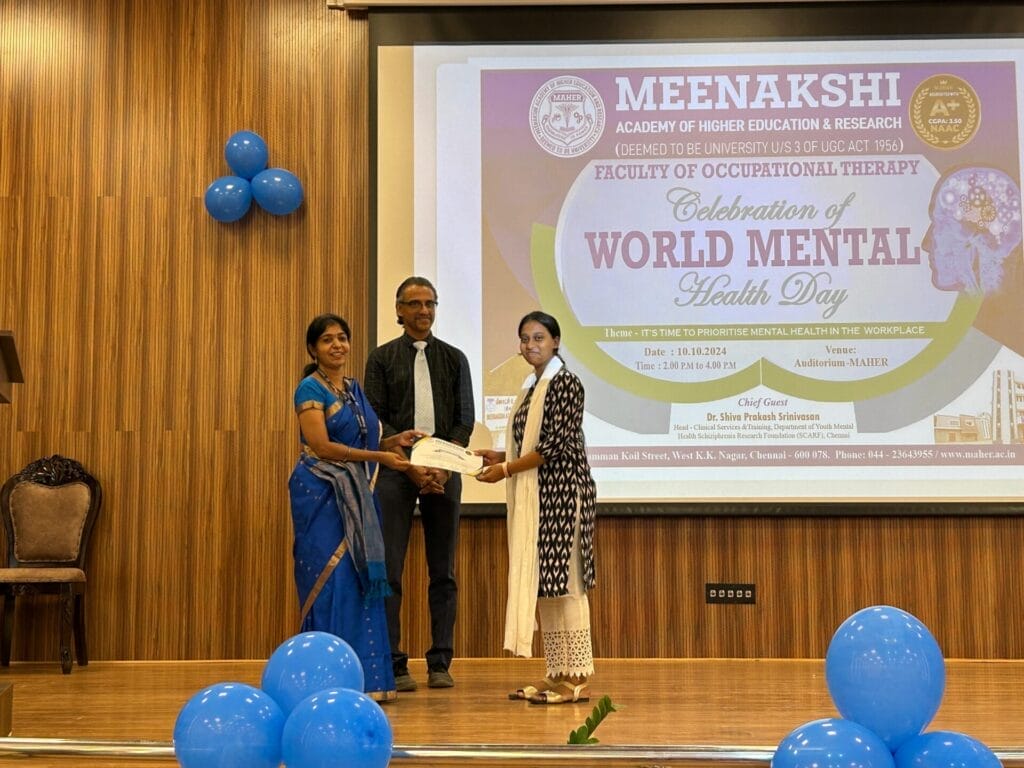 The Faculty of Occupational Therapy MAHER organized “Thrive Together” an event to celebrate World Mental Health Day 2024 on 10/10/2024. The theme for the World Mental Health Day 2024 is “Its time to Prioritize Mental Health in the Workplace”. 164 students and 6 faculties attended the programme. The programme was inaugurated with a shloka to mark a divine beginning, followed by Tamil Thaai Vazhthu. Prof. Deepa Sundareswaran, Principal, FOT delivered the welcome address. Dr. Arunagirinathan, Dean Research, MAHER and Dr. Pushpanagini, Director Online Education, MAHER addressed the gathering with their perspectives on mental health.The chief guest for the event, Dr. Shivaprakash Srinivasan, Head-Clinical services and training, Youth Mental Health, Schizophrenia Research Foundation (SCARF), Chennai gave an insightful talk on the importance of self love, self care and work-life balance. He also emphasized on the importance of preparedness for work, work skills, goal setting and ways to combat stress. A video themed ‘Voices for Mental health’ that captured opinions, views and importance of mental health by various faculty and staff of MAHER was displayed during the celebration. Ms. Kruthika, 3rd Year BOT student recited a Tamil poem about Mental health. The students of BOT performed a mime and prepared a short film to portray the importance of maintaining one’s mental health.