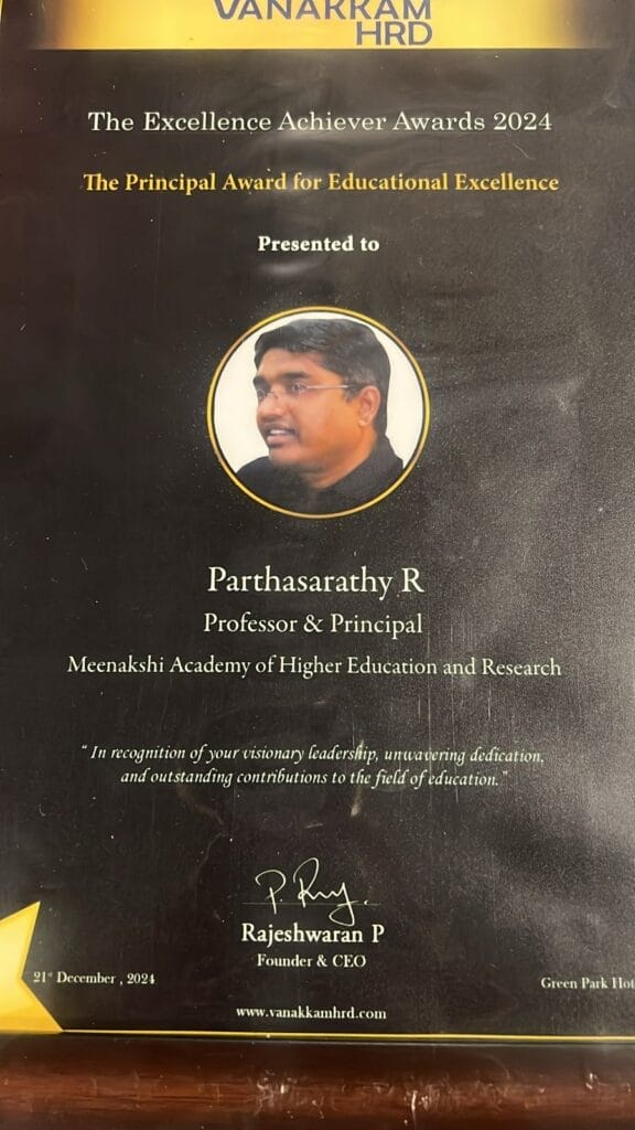 Vanakkam Human Resource Development is a community launched aiming to bring together the best minds from technology ,space to discuss ,share about Branding Local to Global, to learn, nurture the network of minds ,from Students to Professionals, to marketers and business owners. Prof. R. Parthasarathy, Principal ,Faculty of Physiotherapy, MAHER was awarded Principal Award for Educational Excellence on 21.12.2024 at the 2nd Annual State level conference on” Navigating Pathways “ held at Green Park hotel ,Chennai ,for being an exemplary leader as an Educationist & to work in Outreach activities in providing healthcare services in rural & tribal areas of Tamil Nadu which is a good initiative for public health & awareness.
