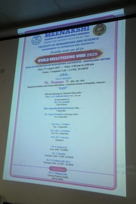 The Department of Nutrition and Dietetics organized a special lecture on “Role of Nutrition in Supporting Lactation – Dispelling Myths” for faculty members and students. The session, attended by nearly 55 participants, was delivered by Ms. N. Haripriya, MSc, RD, CDE, Registered Dietitian and Clinical Nutritionist, Cloudnine Group of Hospitals, T. Nagar. She addressed key aspects of maternal nutrition and its link to breastfeeding success, stressing the importance of early initiation within the first hour after birth, exclusive breastfeeding for the first six months, and continued breastfeeding with complementary foods for at least two years. Her talk emphasized that such practices can help reduce infant mortality, prevent childhood illnesses, and ensure long-term health for both mothers and children.