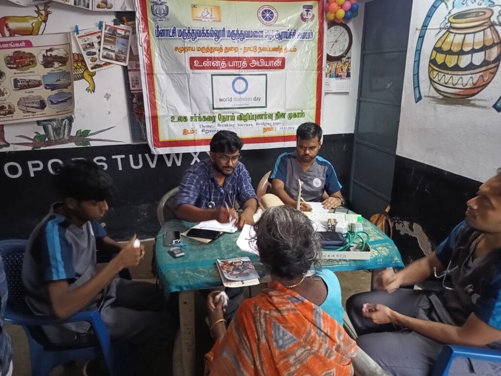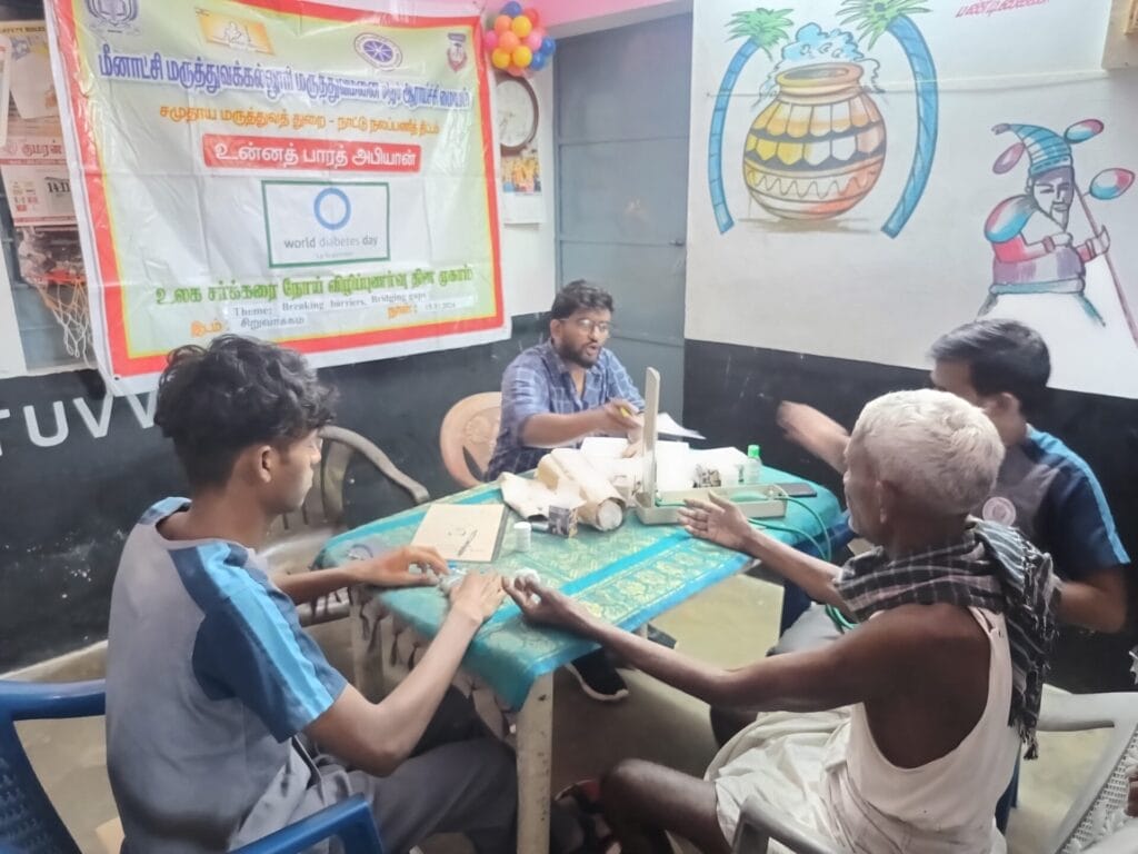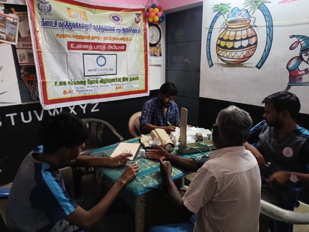 On the occasion of World Diabetes Day November 14, 2024, Diabetes screening and awareness camp was conducted on 15/11/2024 in Siruvakkam village by the Department of Community Medicine, Unnat Bharat Abhiyan Scheme, National Service Scheme. The event started with screening of FBS and PPBS estimation, blood pressure monitoring for the general public followed by Health education on the topic of ‘Awareness and diet practices for Diabetics’ with the theme of “Breaking barriers, Bridging gaps”.