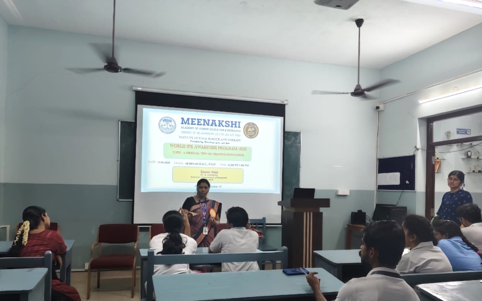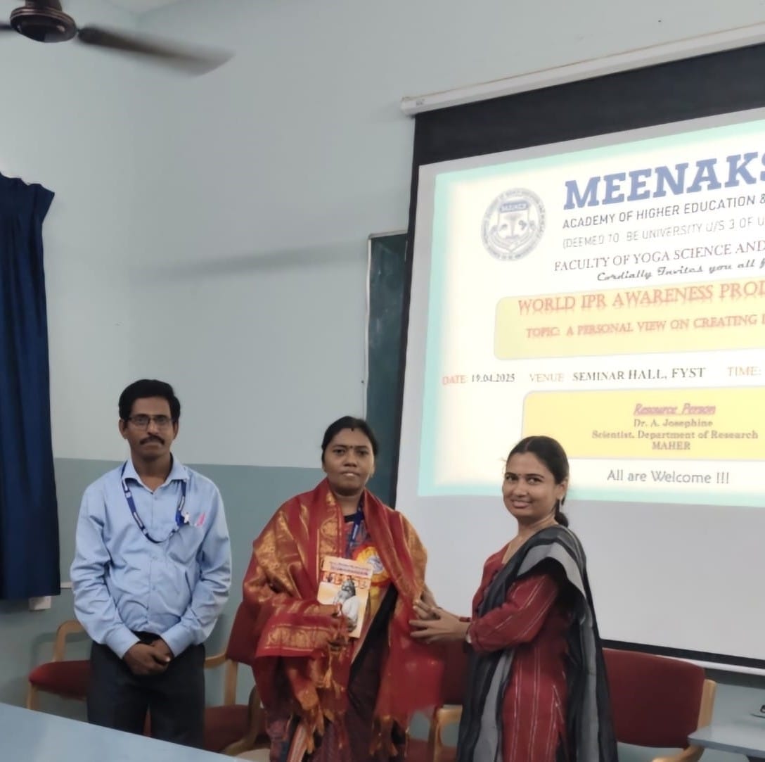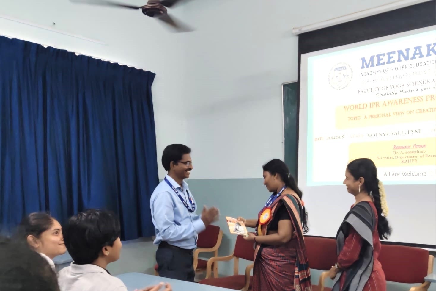 The program commenced with a prayer and a welcome address by Prof. V. Subbulakshmi, Principal, Faculty of Yoga Science and Therapy. The guest speaker, Dr. A. Josephin, Scientist, Department of Research, MAHER, delivered an engaging and insightful session on the importance of IPR, the patent process, and real-world innovations.
