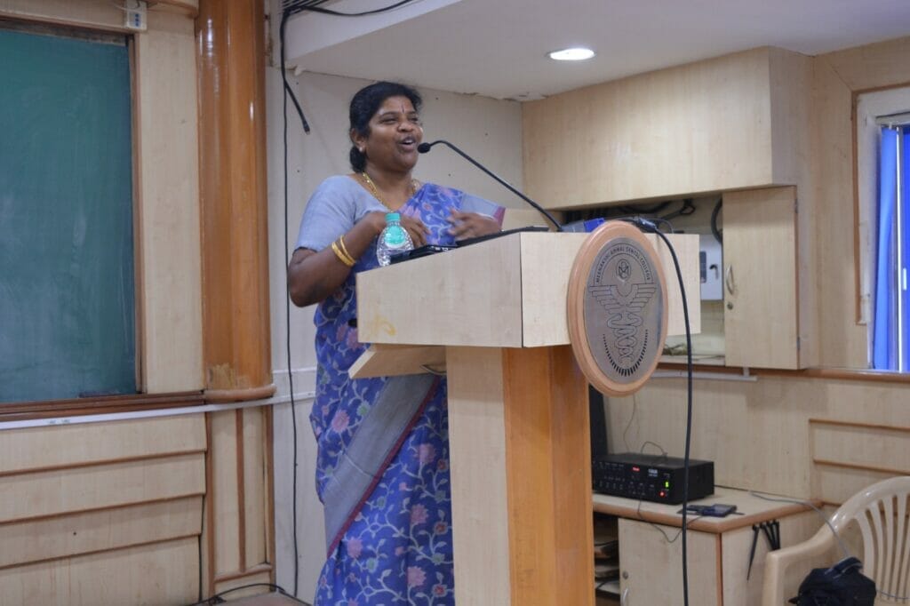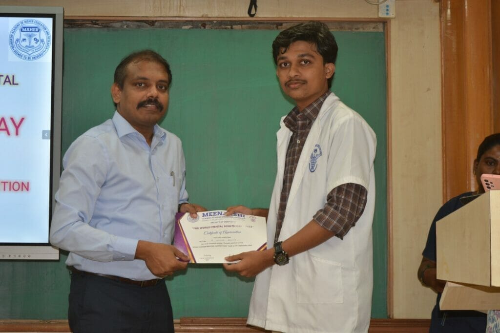 Meenakshi Ammal Dental College and Hospital, MAHER conducted a public awareness session on the topic – “See through your eyes, listen through ears and live through heart” on the occasion of World Mental Health Day on 23rd September, 2023. Dr Veda Vijaya, Professor and Head, Department of Pharmacology who has a diploma in psychological medicine conducted the session. She elaborated on the current challenges of teenagers, their day-to-day difficulties, and ways to overcome them. She also conducted the “Jacobson’s muscle relaxation technique” to overcome stress and anxiety. On the same day, Essay and slogan writing competition was conducted for undergraduate students which saw an active and enthusiastic participation by the students.