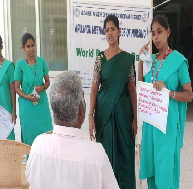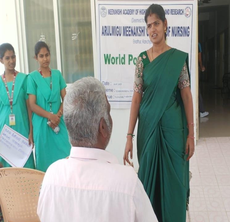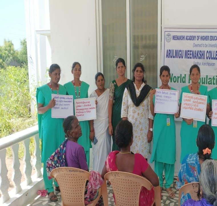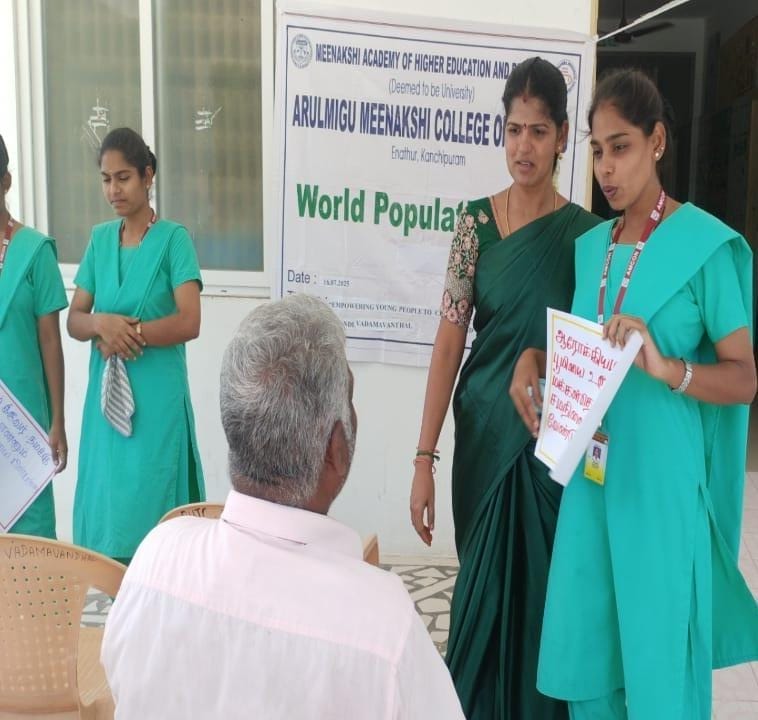 The Arulmigu Meenakshi College of Nursing observed World Population Day 2025 on 16 July 2025 at Vellakulam, Vadamavanthal, under the theme “Empowering Young People to Create the Families They Want in a Fair and Hopeful World.” The event, held from 10:00 AM to 12:00 Noon, commenced with Tamil Thai Vazhthu, followed by a welcome address by Ms. Swathy, III Year B.Sc (N). After the introduction of the chief guest, Dr. Parimala, MBBS, delivered an insightful address on the theme, emphasizing the importance of informed choices and equitable opportunities for young people in building their futures.