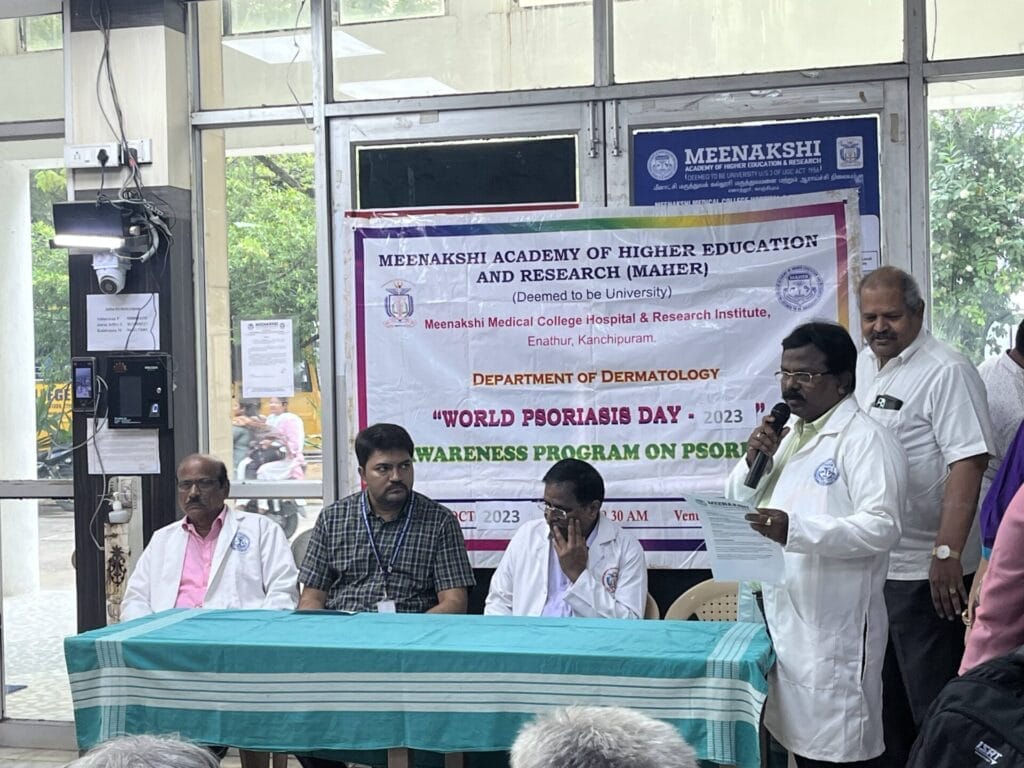 The Department of Dermatology, Venereology and Leprosy, MMCHRI & RI organized The World Psoriasis Day 2023 Awareness Programme, themed “ACCESS TO ALL” on 31.10.2023, Monday. The chief guest Dr. Boopathi, Medical Superintendent MMCH&RI, Dr. Mithun Kumar, Vice Principal, MMCH&RI, Prof. Dr. Sreevinasan, HOD, Dept of Pulmonary medicine, Prof. Dr. S. Kumaravel, HOD, Dept of DVL and Dr. Rajesh Professor, Dept of DVL, MMCH&RI gave their insightful speech on the importance of removing barriers to diagnosis, treatment, emotional support for all individuals, regardless of background or socio-economic status. Theprogram saw a diverse turnout of 50, including doctors and faculties of other departments, undergraduate students, patients with psoriasis, their caregivers, and other staffs of MMCH&RI. Patient education pamphlets were distributed which was written in native (Tamil) language. Medical and surgical management of psoriasis were discussed in detail by the faculty of the department of dermatology, Venereology and leprosy. The Psoriasis awareness programme was well organized by the faculties, post graduates, and other staff members of Dept of DVL. . The “Access to All” theme of the World Psoriasis Day Awareness Programme was successful and reaffirmed the need for inclusive, accessible care for those affected by Psoriasis.  It marked a significant step towards breaking down barriers and ensuring equal support for all.