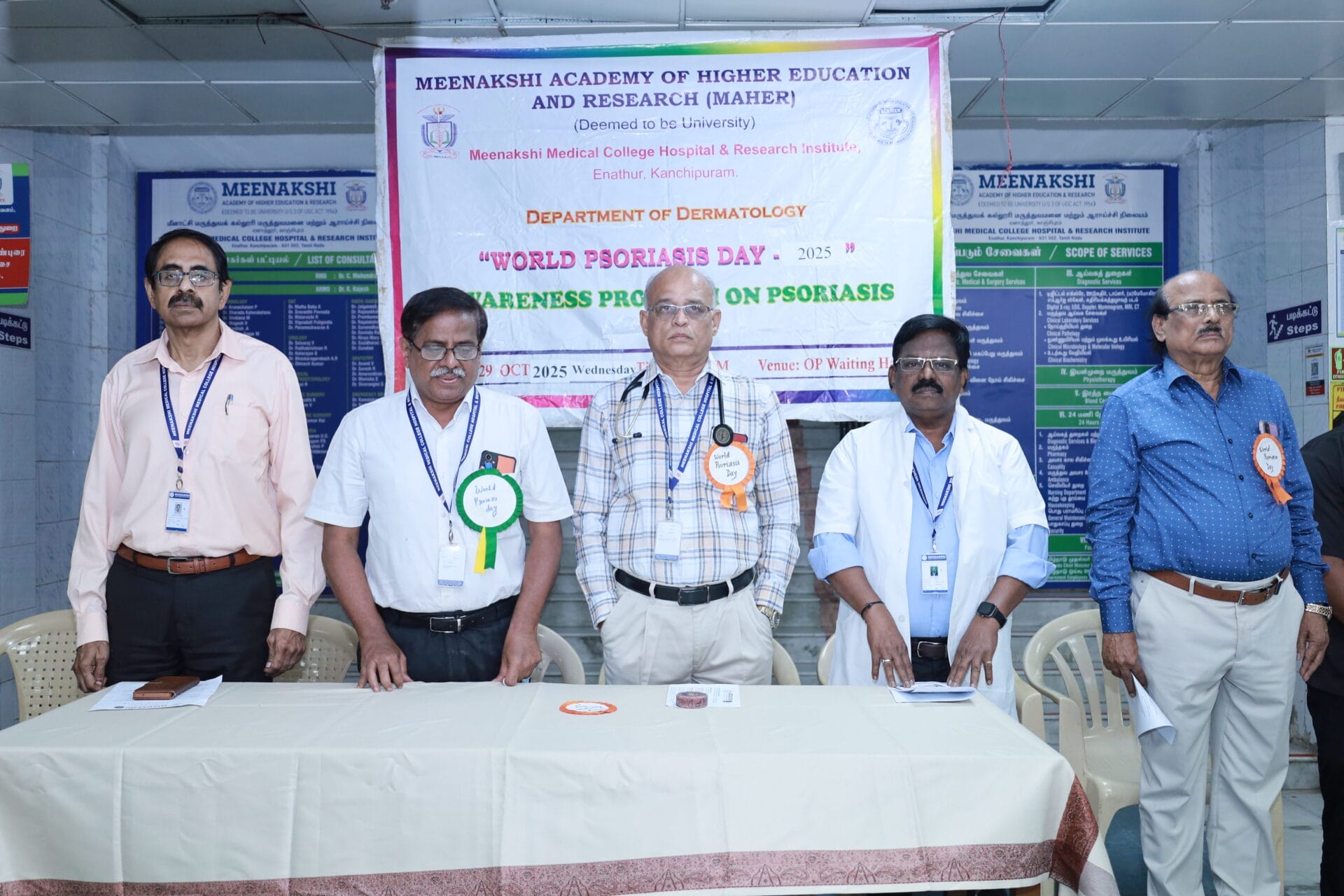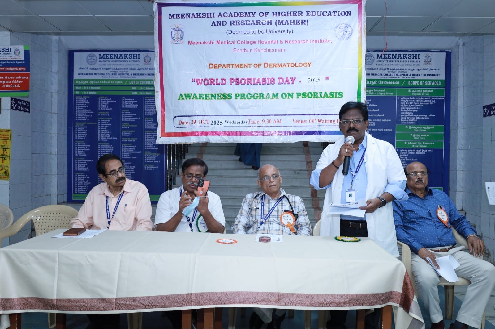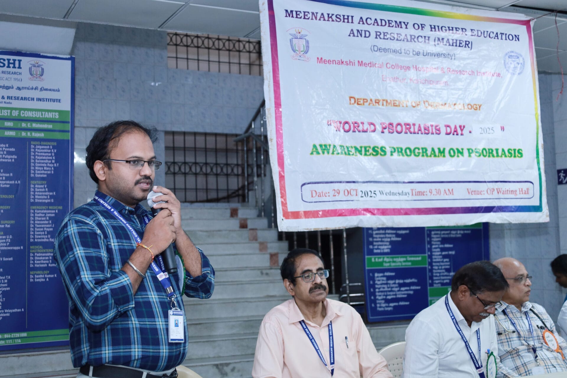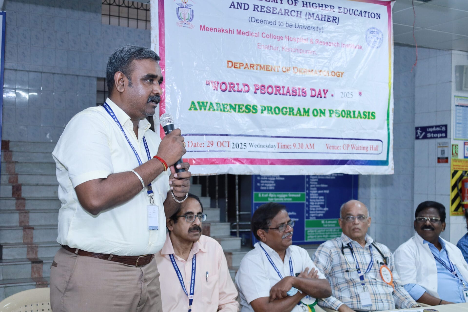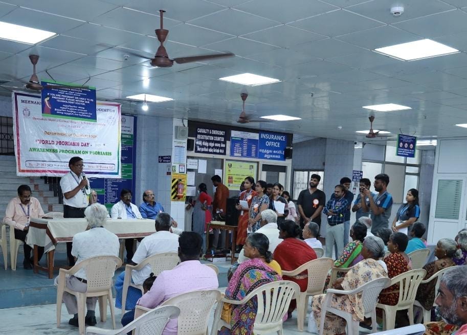 The Department of Dermatology, Venereology, and Leprosy of Meenakshi Medical College Hospital & Research Institute (MMCHRI), Kanchipuram, organized a “World Psoriasis Day Awareness Program 2025” on October 29, 2025, at the OPD Waiting Hall. The event aimed to raise awareness among patients and the public about psoriasis- its symptoms, management, and the importance of early diagnosis.