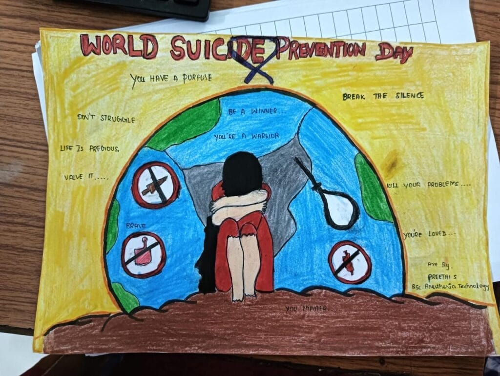 In observance of World Suicide Prevention Day 2024, the Internal Complaints Committee of the Faculty of Allied Health Sciences – MAHER organized a comprehensive awareness program. On September 11, 2024, students engaged in a live webinar hosted by the Directorate General of Health Services (Dte. GHS), Ministry of Health and Family Welfare, Government of India. Dr. B. Durga, Vice Principal (Admin), FAHS, delivered a crucial presentation on suicide prevention. The event also featured a poster/art marking competition on the theme ” Breaking the silence -connecting the Hearts Saving lives” for first-year Allied Health Sciences students. The winners are recognized and appreciated for their creative contributions in raising awareness about suicide prevention. Approximately 200 students enthusiastically participated in this important program, reflecting our collective commitment to mental health and support.