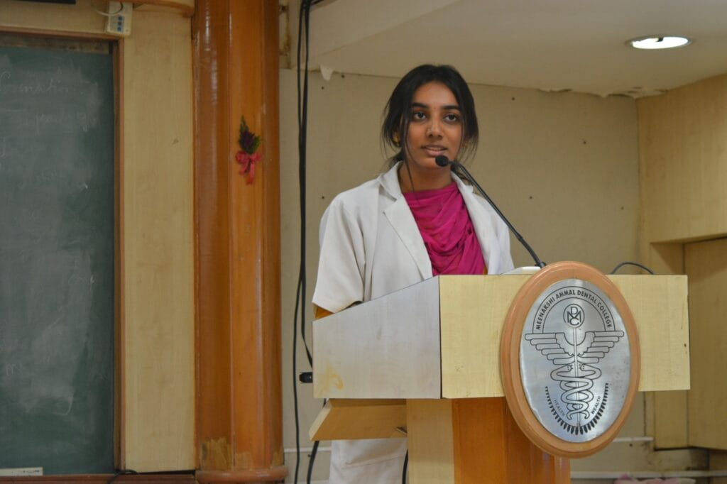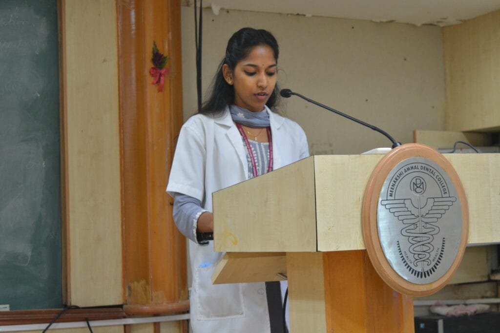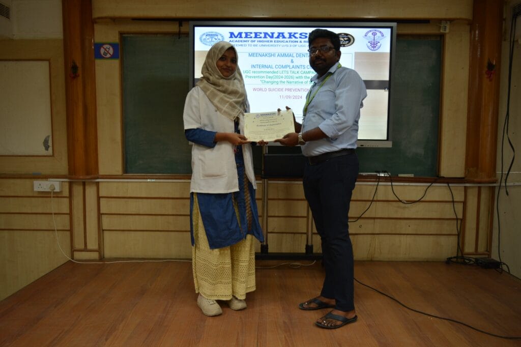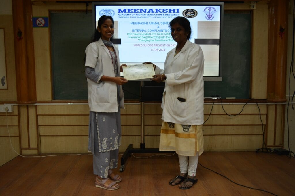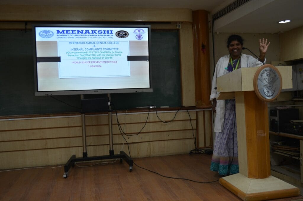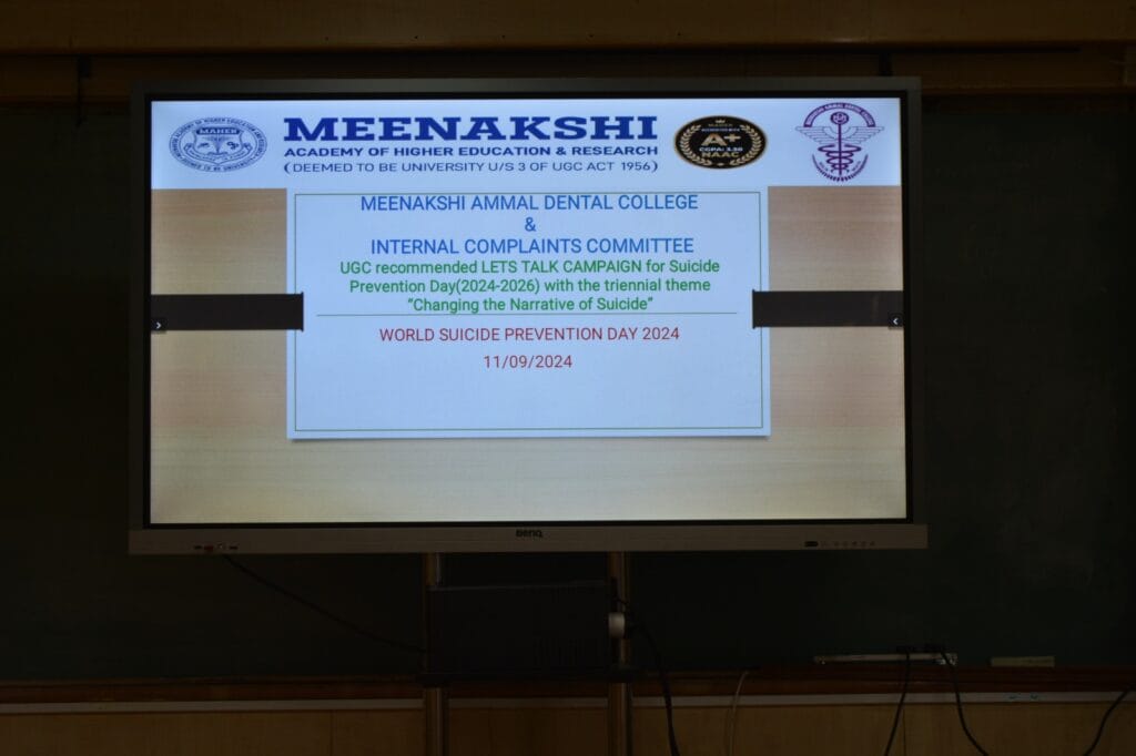 “Meenakshi Ammal Dental College and Hospital, in association with the Internal Complaints Committee, observed the UGC-recommended World Suicide Prevention Day (2024-2026) with the triennial theme “Changing the Narrative of Suicide”. As part of the “Let’s Talk” campaign, six 3rd BDS students – Rachel Louis Francis, Avanthika R.M, Shalini Prakash, Benazeer Banu I, Praveen S K, and Afrah Aliflam – delivered presentations on various aspects of suicide prevention. The event featured a guest lecture by Dr. Veda Vijaya, Head of the Department of Pharmacology, and our in-house psychologist. The students received certificates of appreciation for their outstanding contributions. The campaign aimed to raise awareness and promote open conversations about mental health and wellness.”